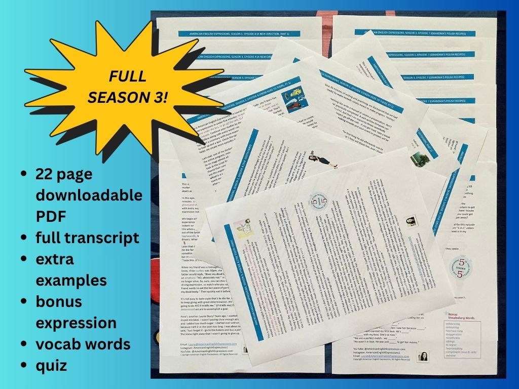 In one easy bundle, you can download the Transcript Study Guides from all 10 episodes from Season 3. This 22-page PDF will help you review every expression you learned from the podcast with full transcripts, quick summaries with extra examples, bonus expressions not mentioned in the podcast, vocabulary words to look up and learn, plus a quiz!