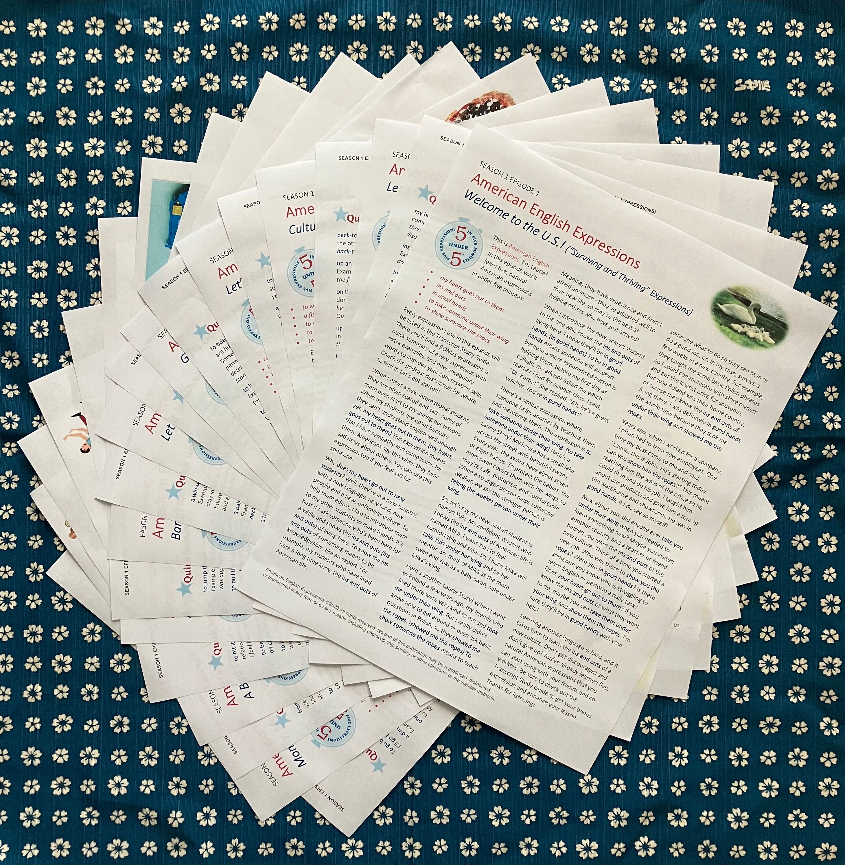 In one easy bundle, you can download the Transcript Study Guides from all 10 episodes from season one. This 20-page PDF will help you review every expression you learned from the podcast with full transcripts plus quick summaries with extra examples, bonus expressions not mentioned in the podcast and vocabulary words to look up and learn.