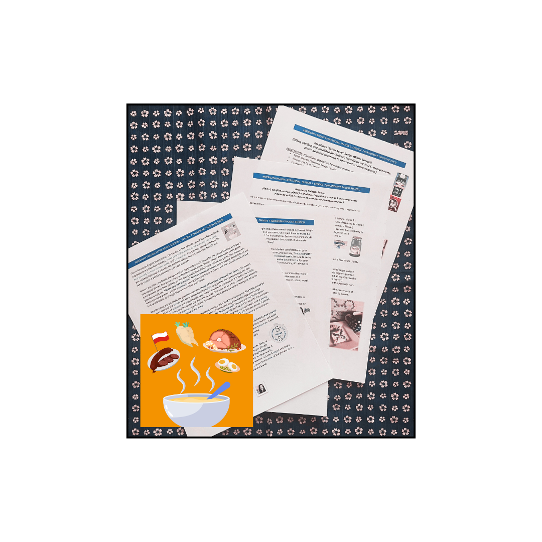 This four-page PDF features two family recipes, the full transcript to this podcast episode plus extra examples of the expressions you learned: make yourself at home, to be ahead of one’s time, help yourself, to have a sweet tooth, and to make do. Also contains a bonus expression not mentioned in the podcast, vocabulary words to look up, and a quiz!